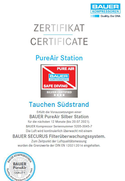 Der Kompressor von "Tauchen Südstrand" ist bereits als offizielle BAUER PureAir Station zertifiziert. Der Prüfung unserer Luftqualität durch einen autorisierten BAUER-Partner unterziehen wir uns regelmäßig jedes Jahr in der Saison. Unser Kompressorsystem wird einer gründlicher Überprüfung, kompletter Wartung und Analyse der Luft unterzogen. Dabei erfolgt eine Messung von Sauerstoff, Kohlenmonoxid, Kohlendioxid, Öl und Feuchte in unserer Pressluft nach den Kriterien der Atemluftnorm DIN EN 12021.